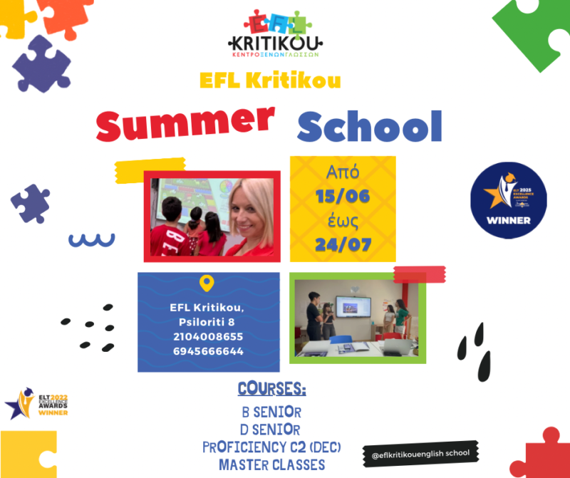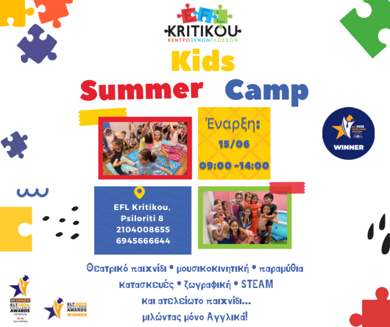 Το Kritikou English Speaking Back-to-School Camp (1–10 Σεπτεμβρίου) προσφέρει σε παιδιά 5–10 ετών έναν συνδυασμό δημιουργικών δραστηριοτήτων, αγγλικής γλώσσας και θεματικών projects που προετοιμάζουν ιδανικά για τη νέα σχολική χρονιά.